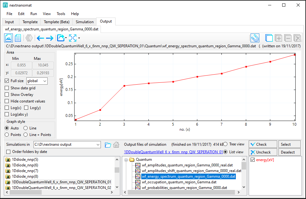 If you have already done some sweeps in the past, you can also use the post-processing feature of nextnanomat retroactively. Note, additional to the post-processing steps described above, you need to load the correct template file and select and fill in the same variable values which have been used for the sweep.