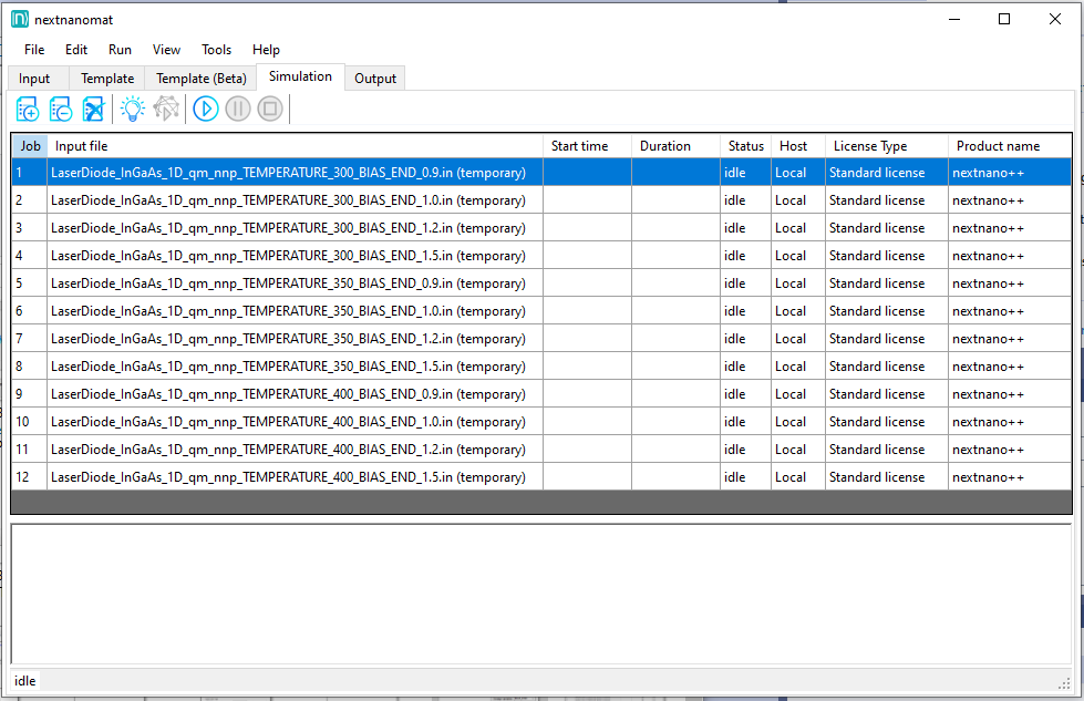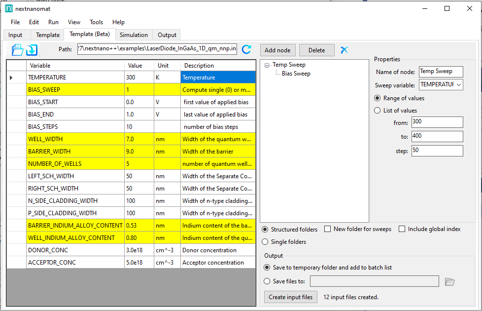 The Template (Beta) tab has a similar functionality to the Template tab. It allows convenient sweeps of an input file through the use of variables. In comparison to the standard Template feature, the Beta version allows nested sweeps of multiple variables. Its use is intended for experienced users who need to investigate their structure in complex dependency of more than one variable.