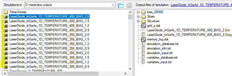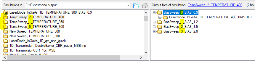 Either the option Single folders or Structured folders can be selected. The first option generates one unique simulation output folder for each input file (ergo, for this example separate 12 folders, see Figure 1.1.15), whereas the structured option generates nested output folders matching the sweep structure. For the structured option a global index can be included which enumerates each sweep (Figure 1.1.16). And/Or a parent folder - for each sweep - can be added (Figure 1.1.17).
