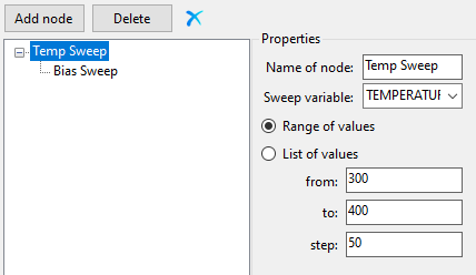1. To create a nested sweep, select a parent node before clicking on the Add node button. The new node will be nested below the selected one. (e.g. “BiasSweep”, Figure 1.1.13)