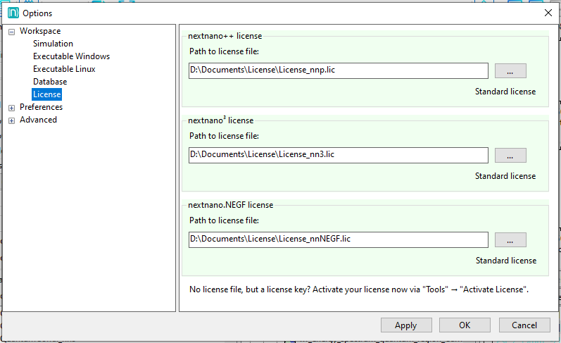 Figure 1.2.4 Settings for nextnano License(s).