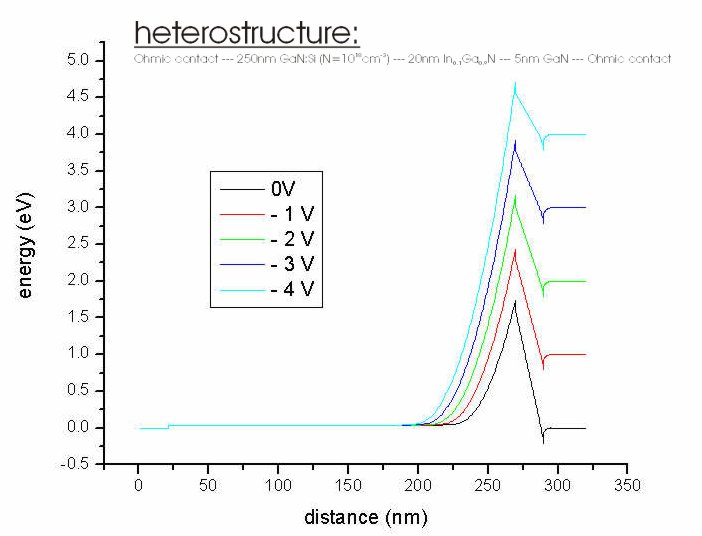 Gamma conduction band edge for voltages of 0 V, 1 V, 2 V, 3 V and 4 V.
