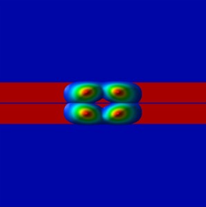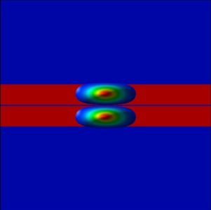 The following figure shows the confined eigenstates Ez of the coupled, symmetric QW system (1D simulation along the z direction).