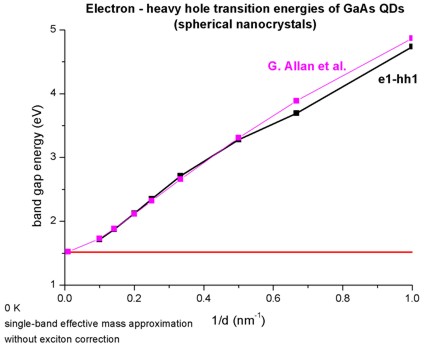 The following figure shows the energies of the electron ground state and the heavy hole ground state in spherical GaAs nanocrystals as a function of the inverse of the nanocrystal diameter d (d = 1 nm / 1.5 nm / 3 nm / 4 nm / 5 nm / 7 nm / 10 nm).